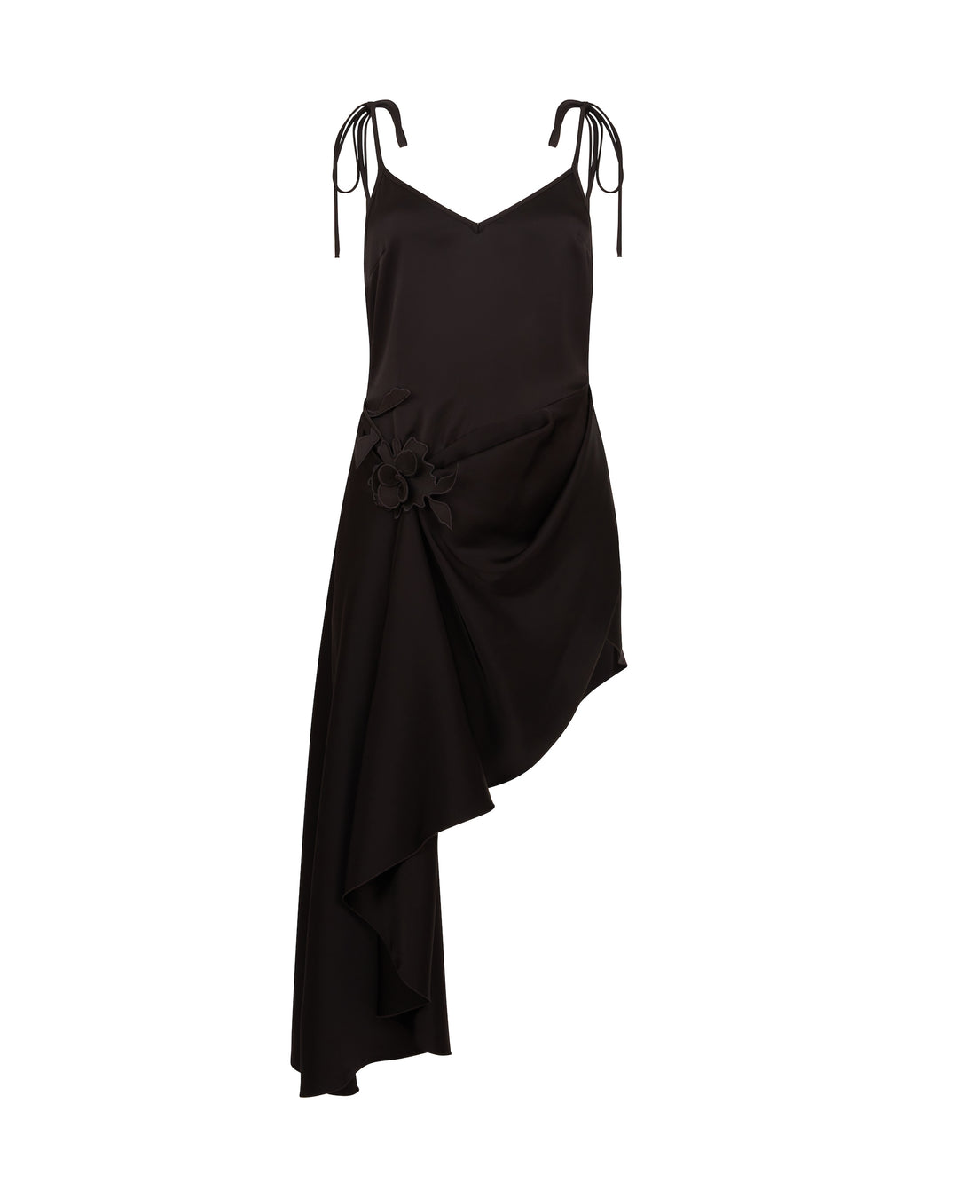 3D LACE FLOWER SATIN MIDI DRESS IN BLACK