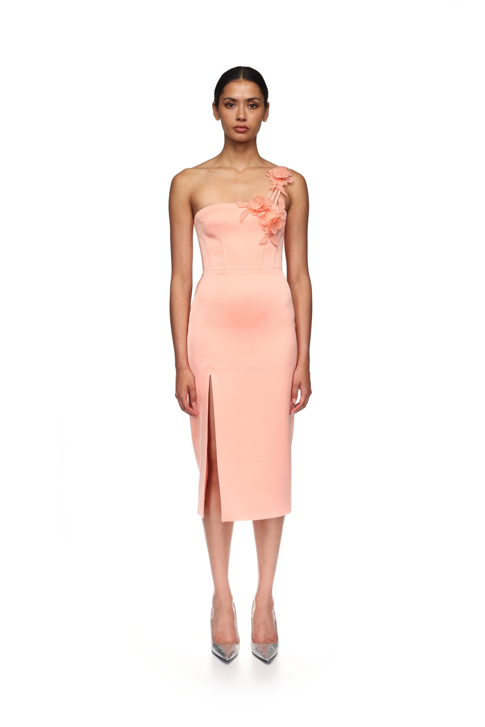 ASYMMETRIC LACE ROSE SATIN MIDI DRESS
