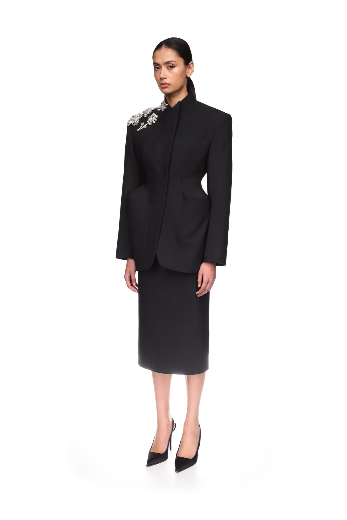 Made in the UK with black tailoring wool, this tailored jacket has a high collar, long sleeves, structured shoulders, and crystal-embroidered floral brooches on one shoulder. This jacket also features statement padded hips that create an hourglass silhouette. It fastens with poppers down the front.