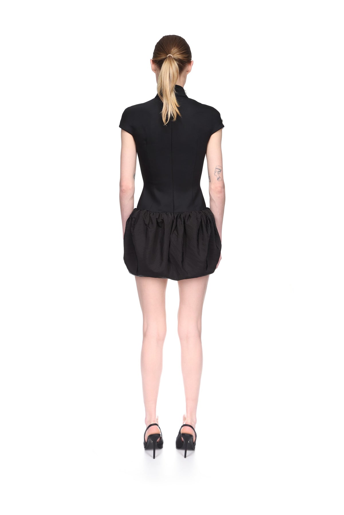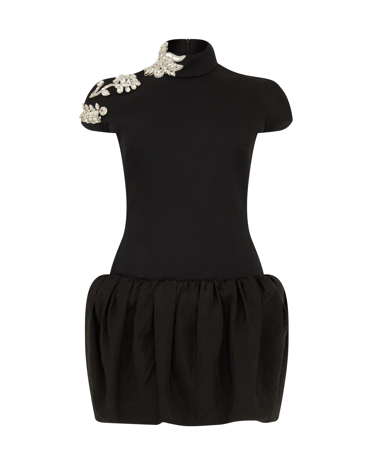 Made in the UK with black tailoring wool and nylon, this short-sleeved mini dress features a puff skirt and crystal floral brooches embroidered across one shoulder. This dress fastens with a hidden zip closure at the back.