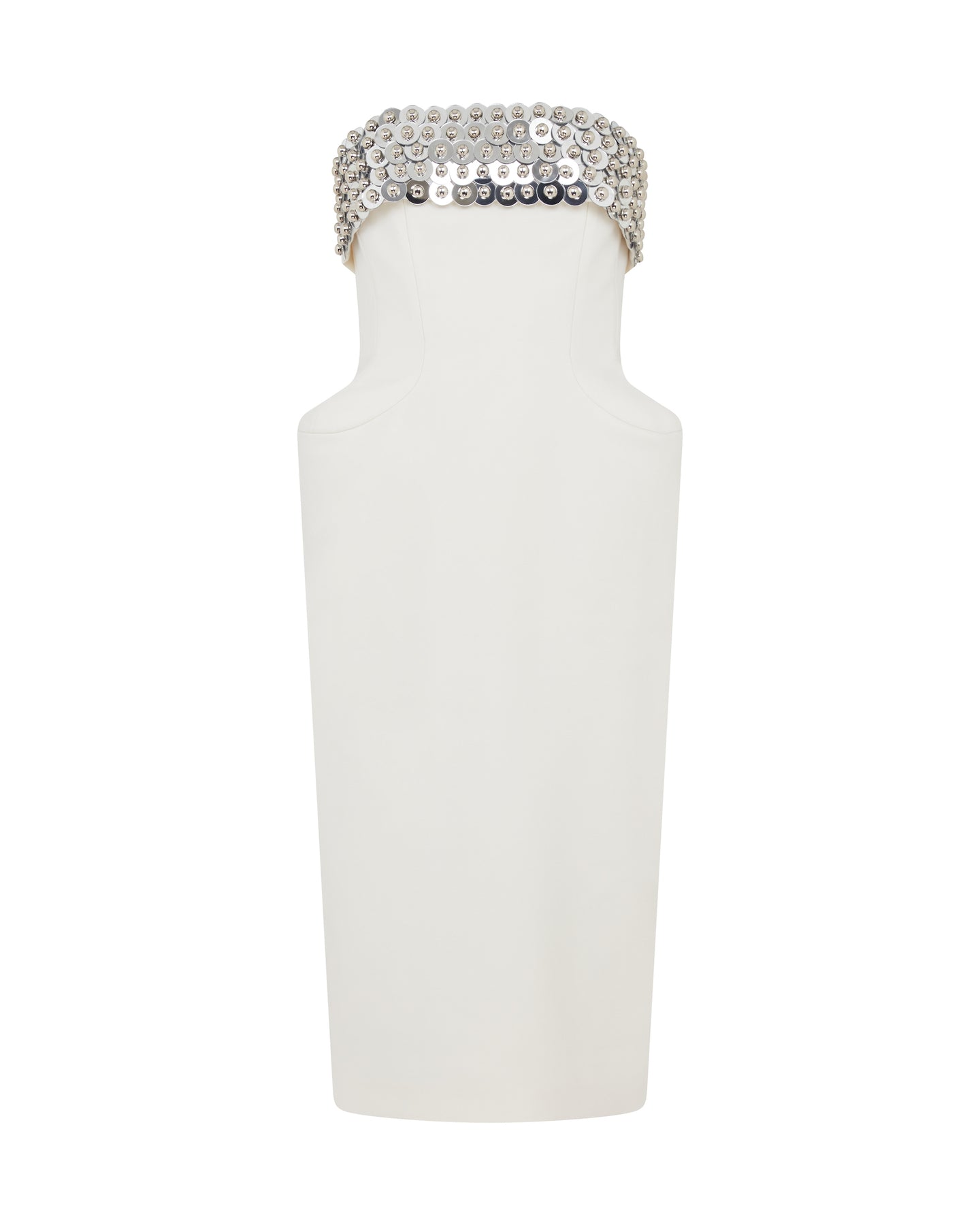 Made in the UK with white tailoring wool, this sleeveless midi dress has glittering silver spheres embroidered on a trim over the bust and padded hips that create a statement hourglass silhouette. This dress fastens with a hidden zip closure at the back.