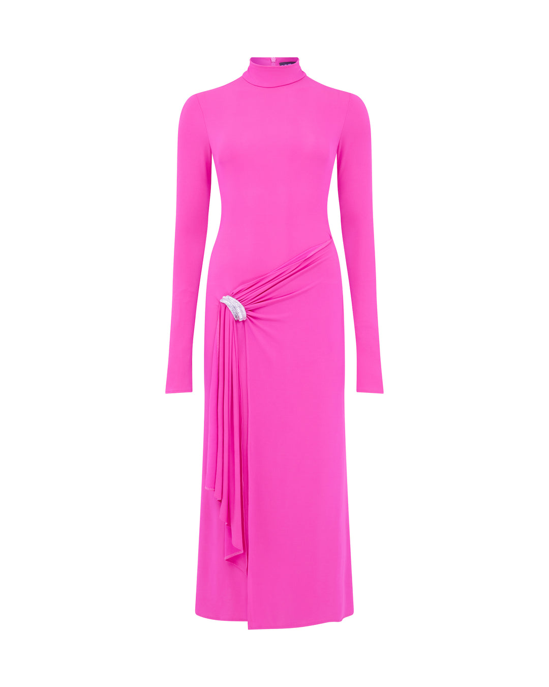 CRYSTAL BROOCH AND DRAPED HEM MIDI DRESS