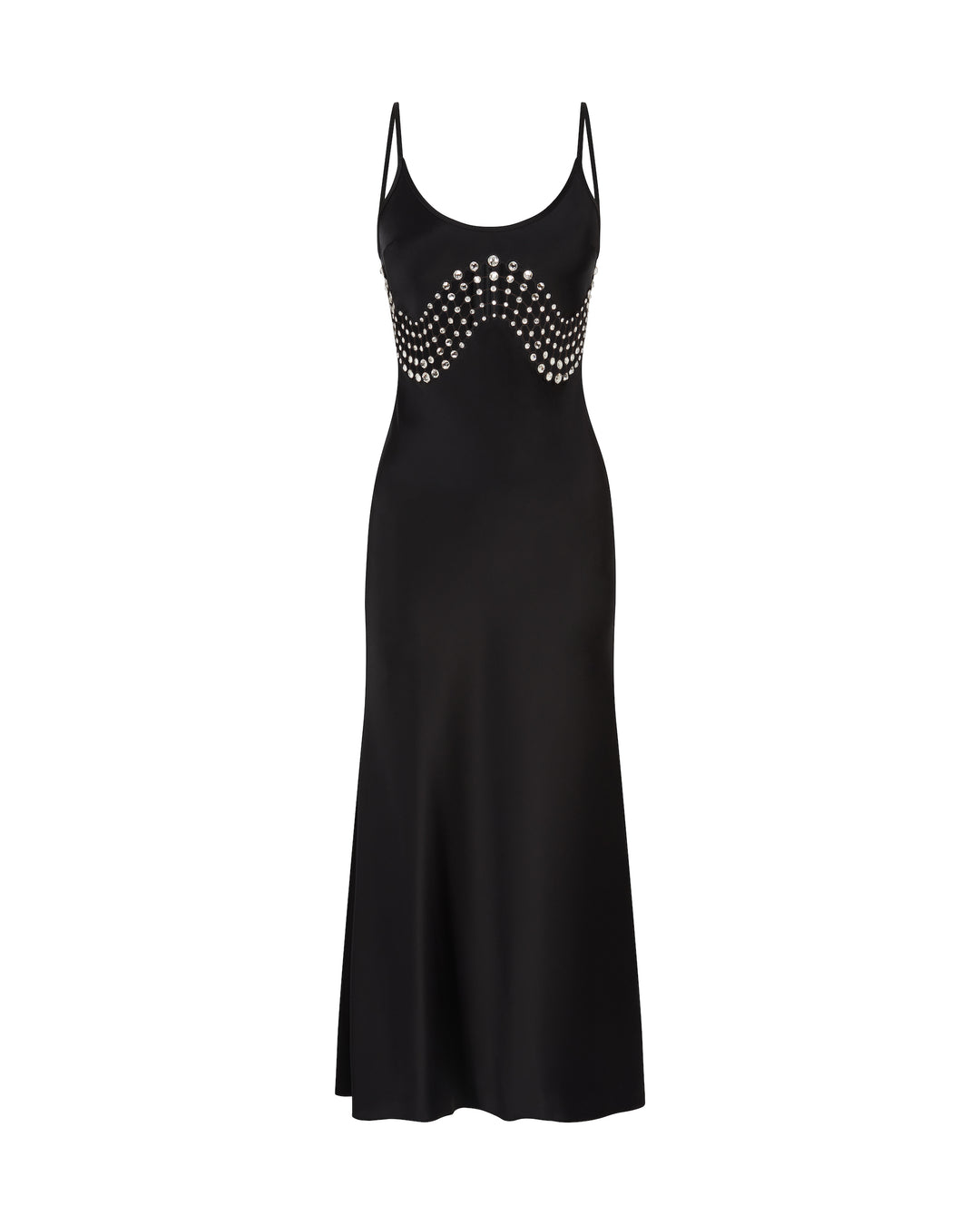 MIDRIFF WAVE EMBR MIDI SATIN DRESS