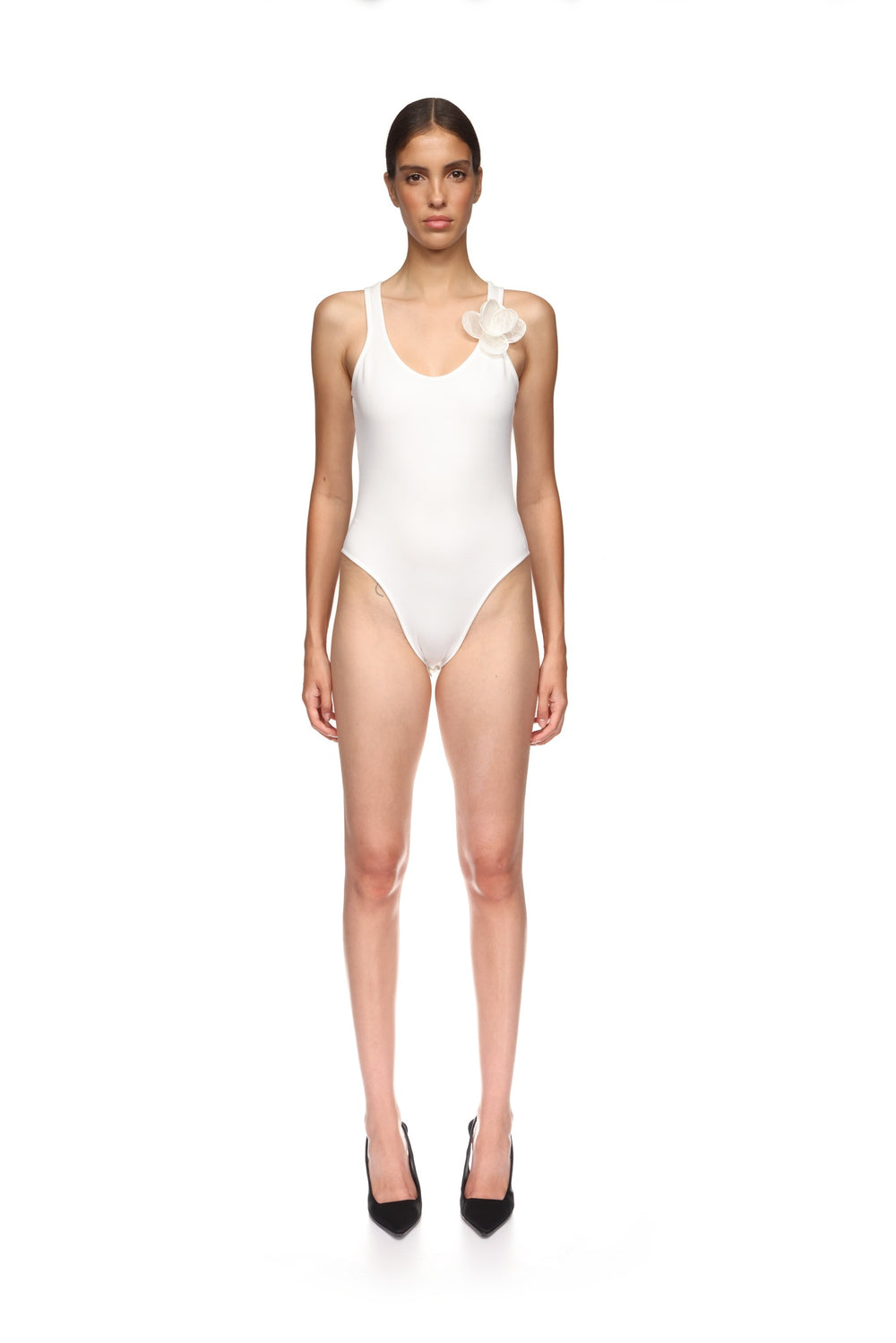 3D LACE FLOWER JERSEY BODYSUIT IN WHITE