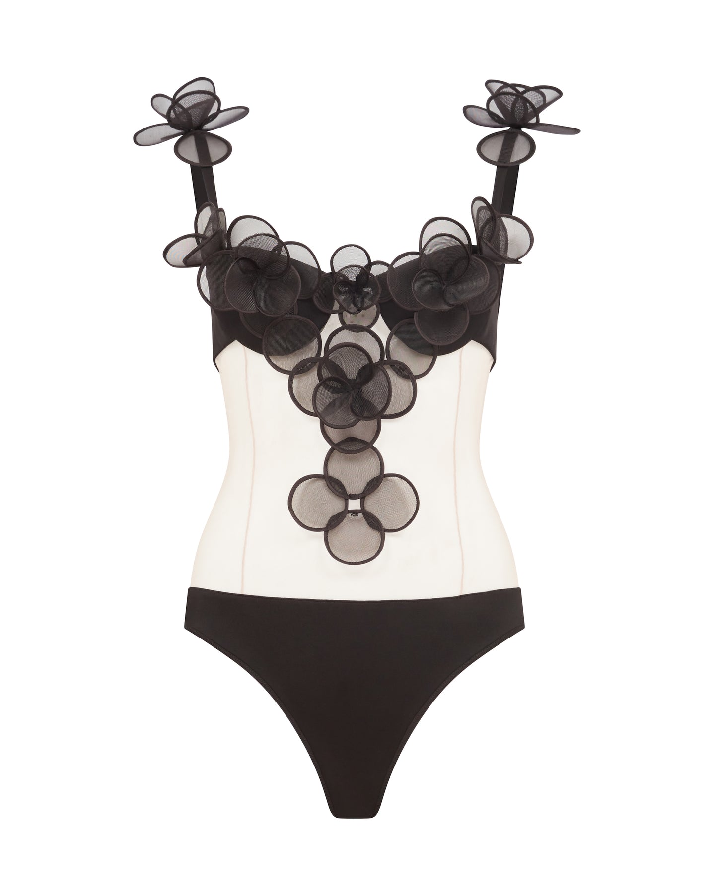 Made in the UK with black satin, this bodysuit has a black bra and panties design with a beige tulle over the abdomen. It features 3D lace flowers embroidered on the straps, over the bust, and down the front. It fastens with a hidden zip closure at the back and poppers on the bottom.