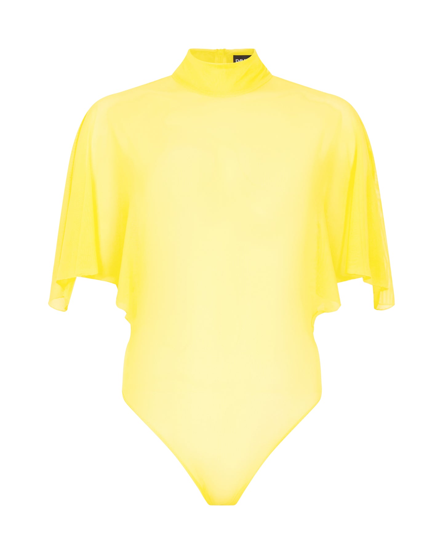 Made in the UK with a sheer mesh, this buttercup yellow bodysuit features a high neck and draped sleeves. It fastens with a zip closure at the back and poppers at the bottom.