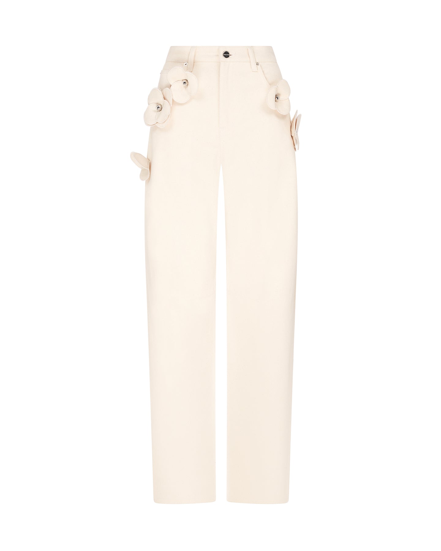 Made with 100% cotton, these ecru denim trousers are cut in a barrel-leg style and feature 3D flowers embroidered at the front. They fasten with a zip and button at the front.