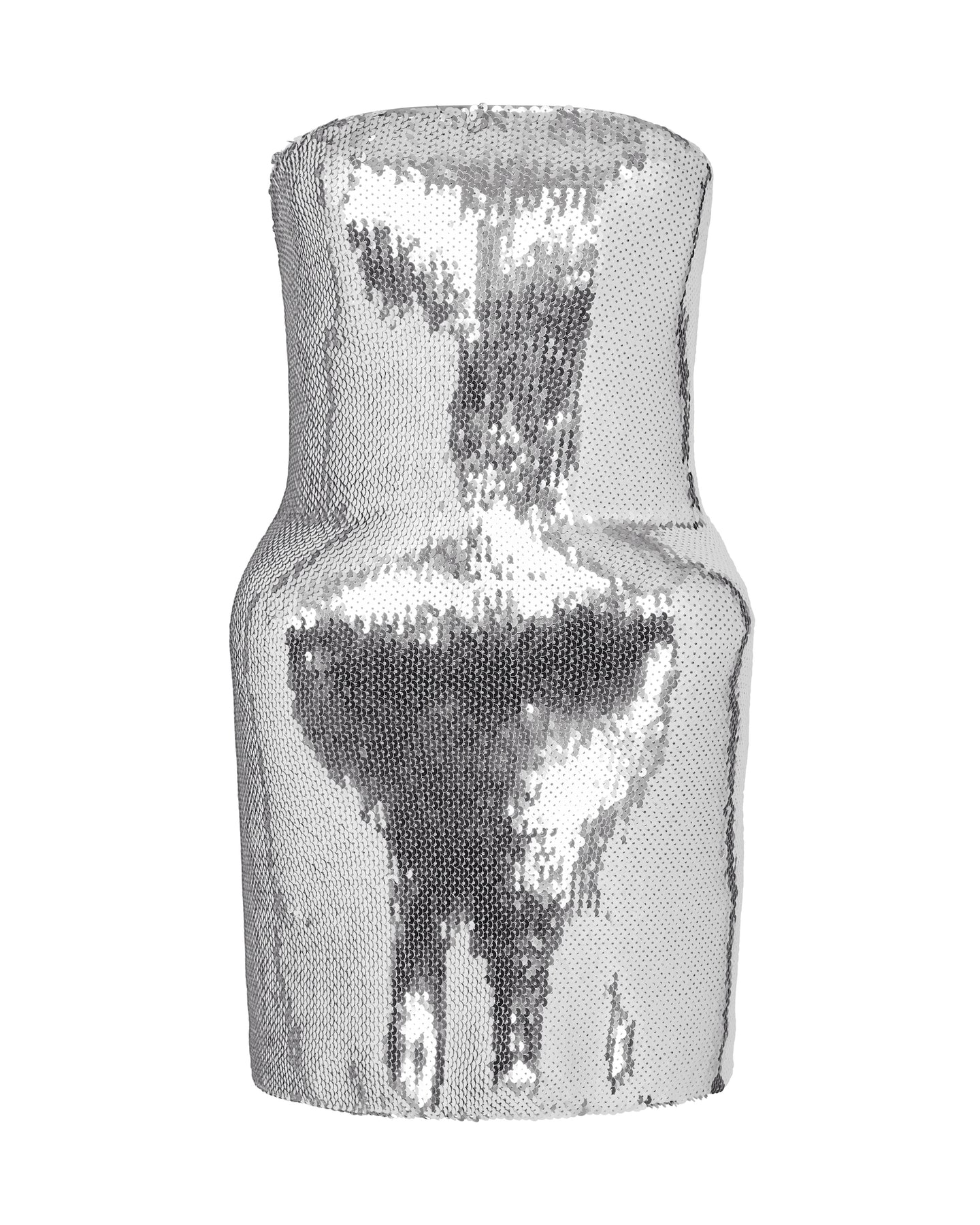 Made in the UK with recycled sequins, this silver strapless mini dress features statement padded hip details. This dress fastens with a hidden zip closure at the back.