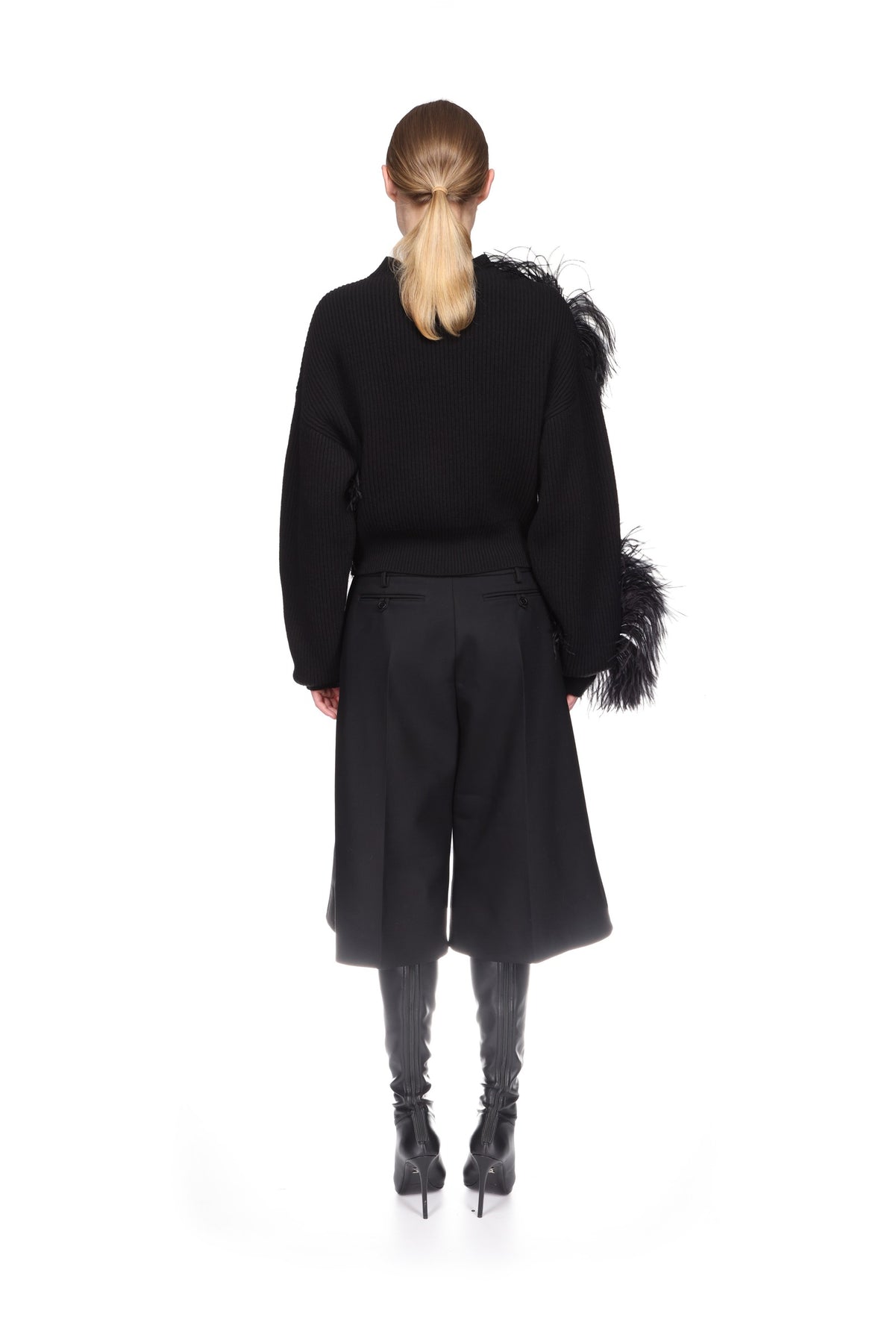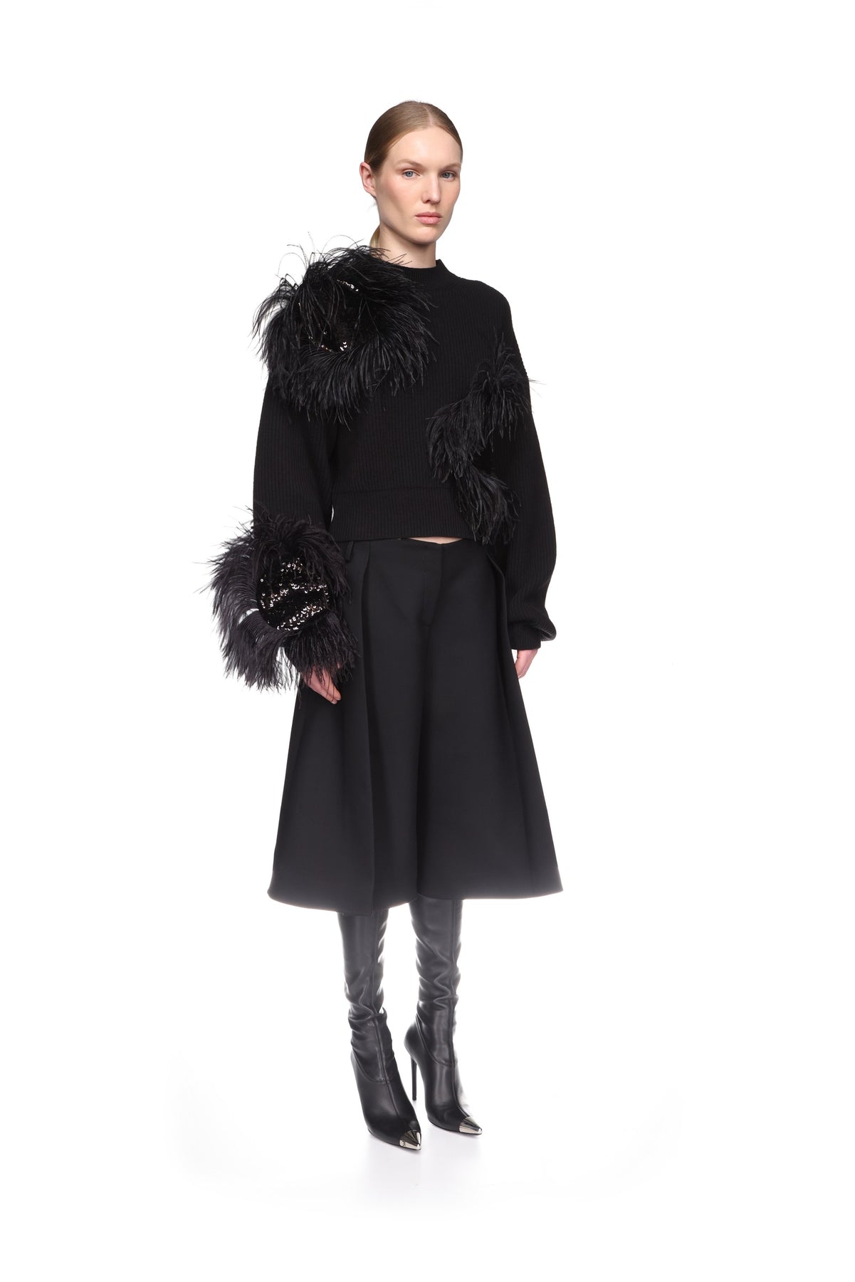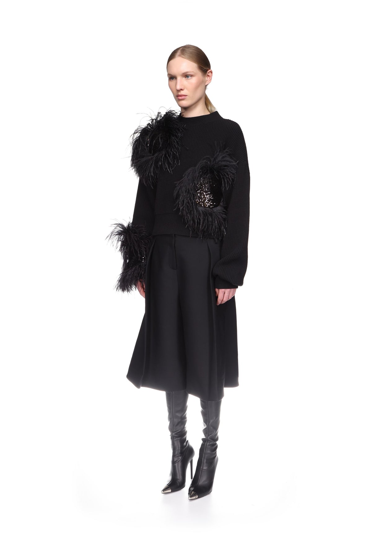 Made with feathers and sequins, this relaxed knit jumper has dropped shoulders and long sleeves. It features three large polka-dot details created with recycled black sequins and ostrich feathers. Please note: we only source ostrich feathers that are a by-product of the meat industry.