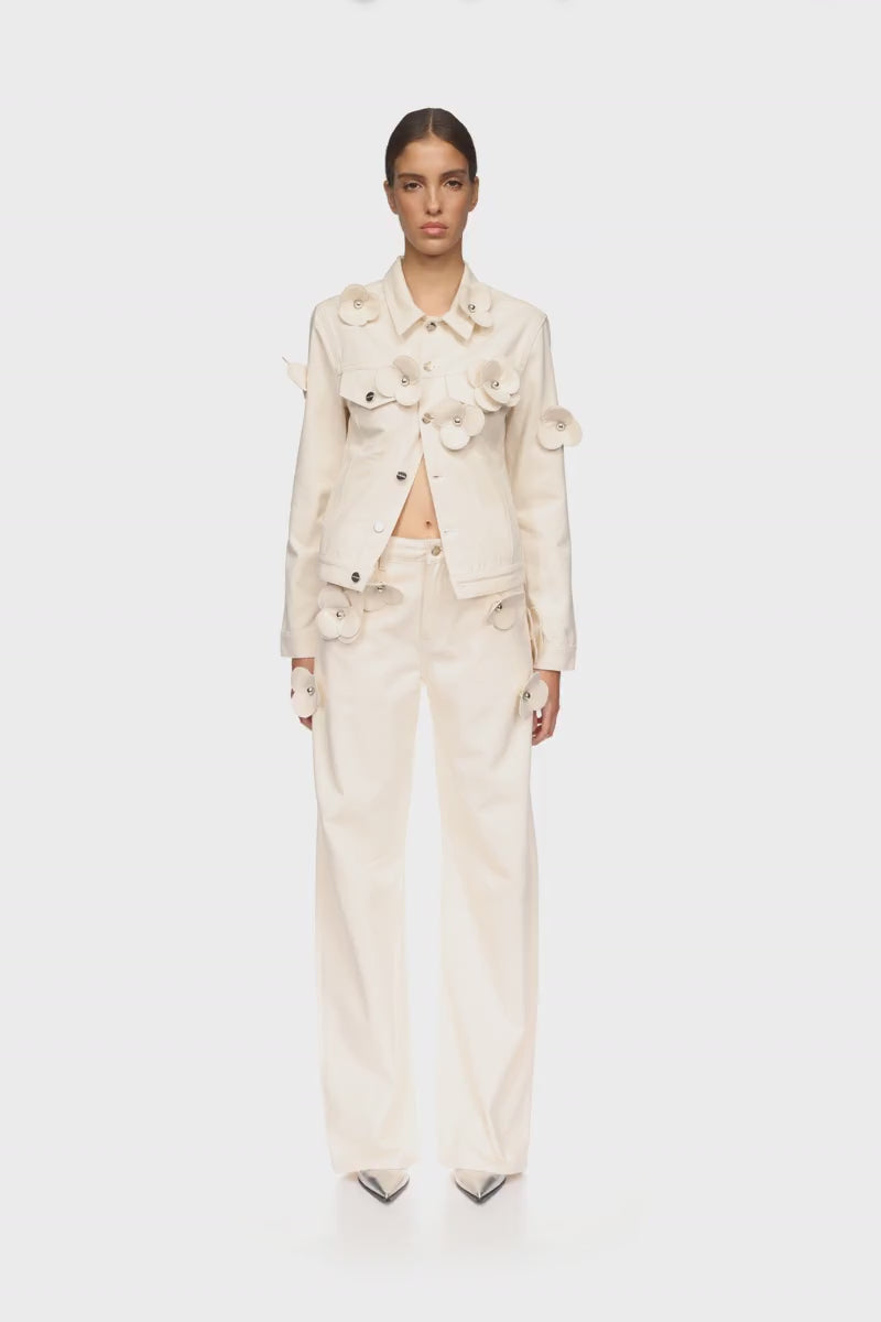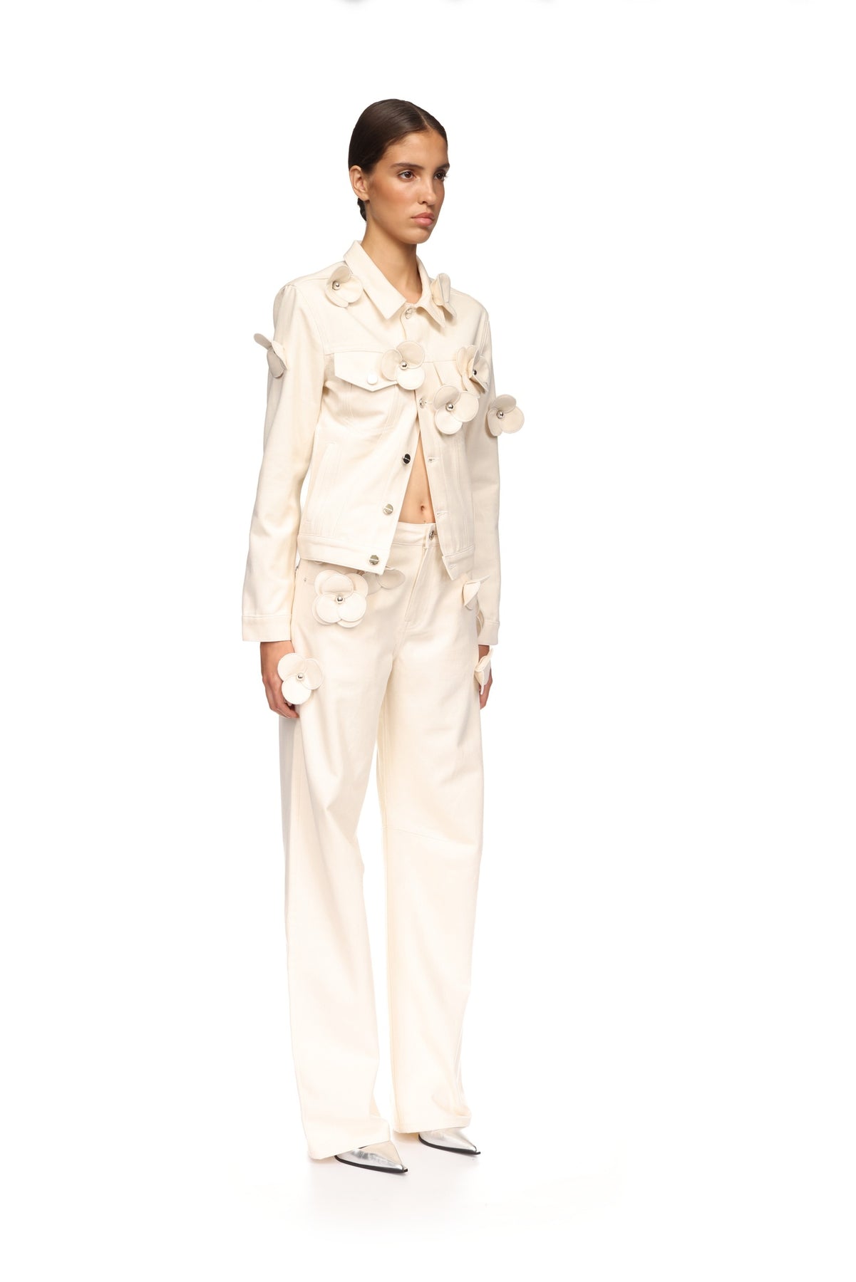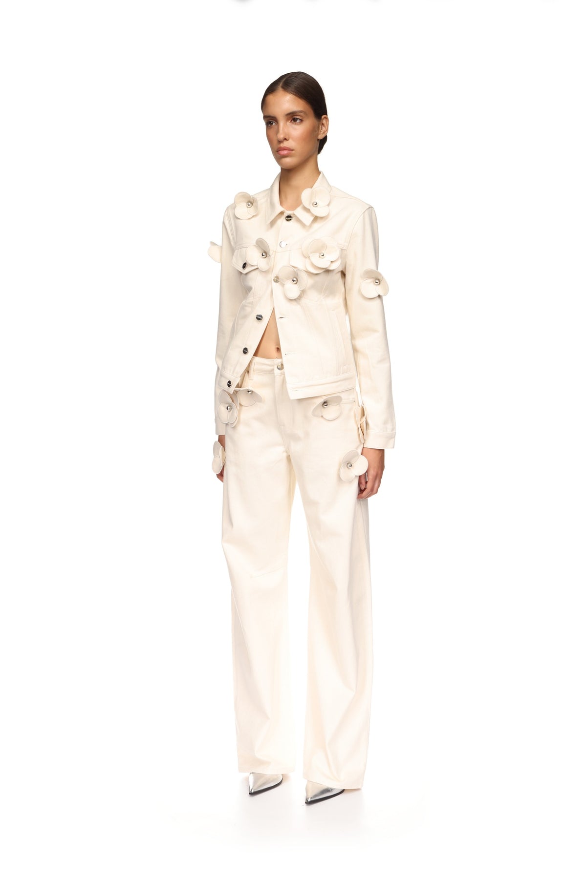 Made with 100% cotton, this ecru denim jacket features 3D flowers embroidered across the front. It fastens with buttons down the front.