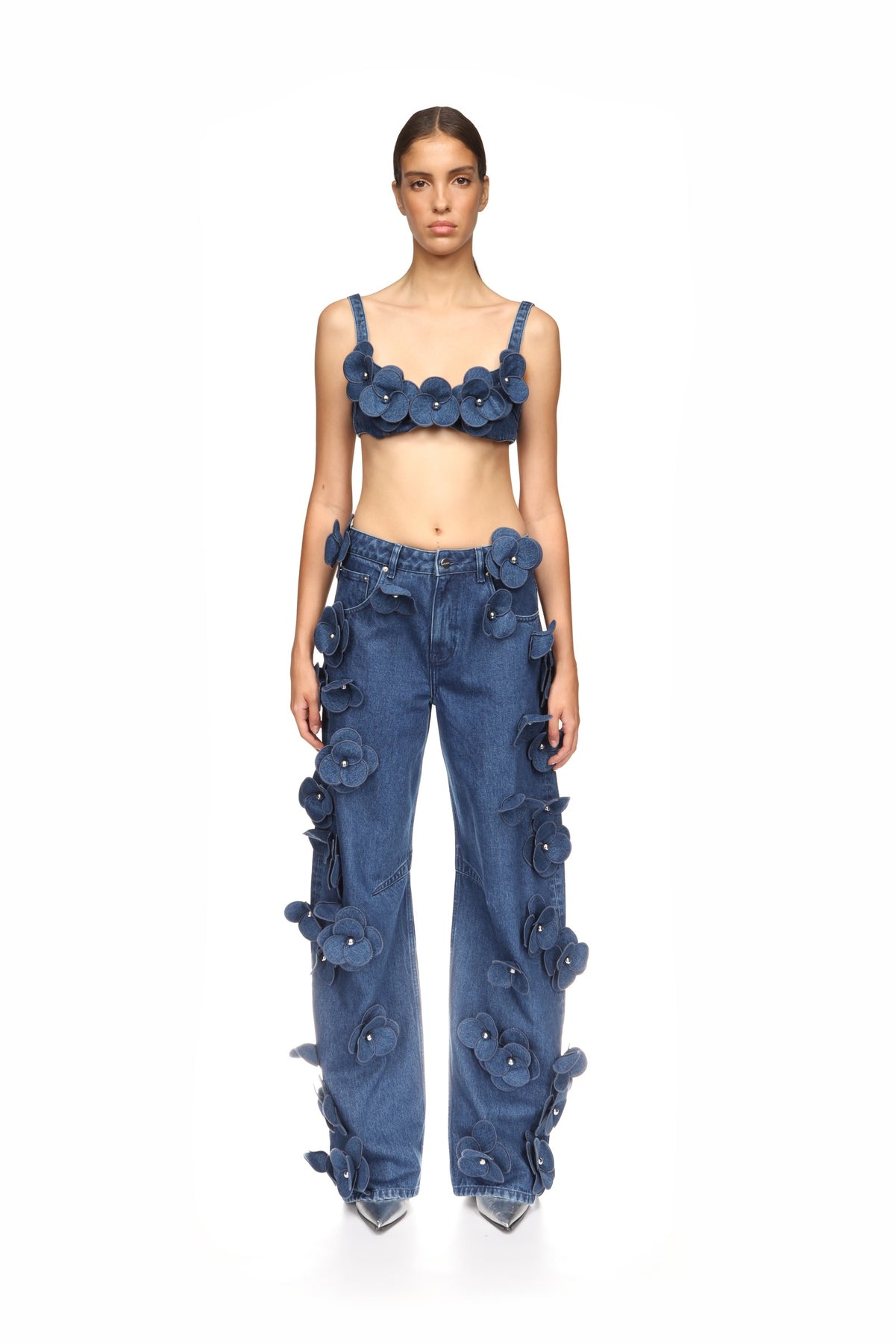 Made with 100% cotton, this indigo denim bra features 3D flowers embroidered over the bust and fastens with a zip closure at the back.