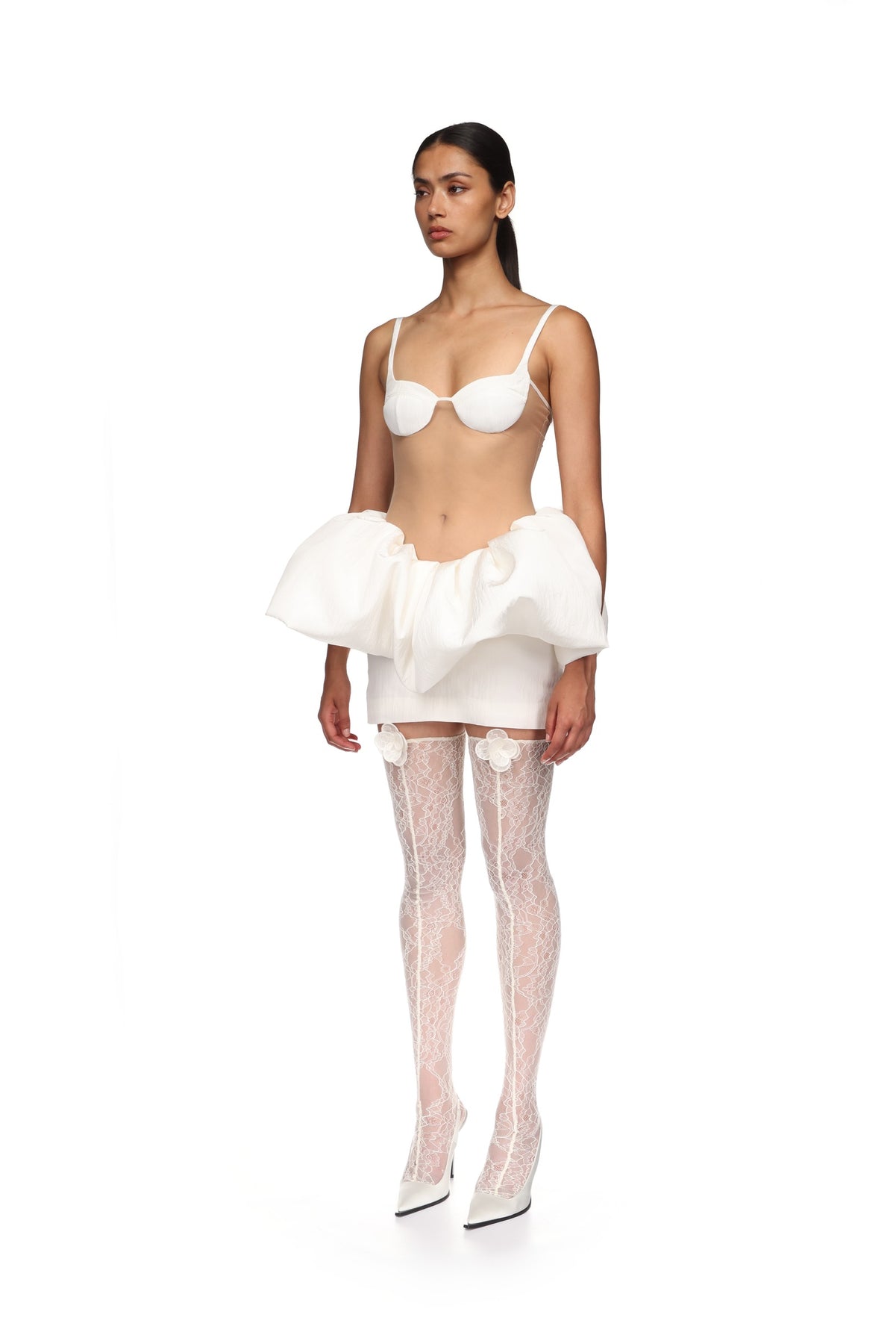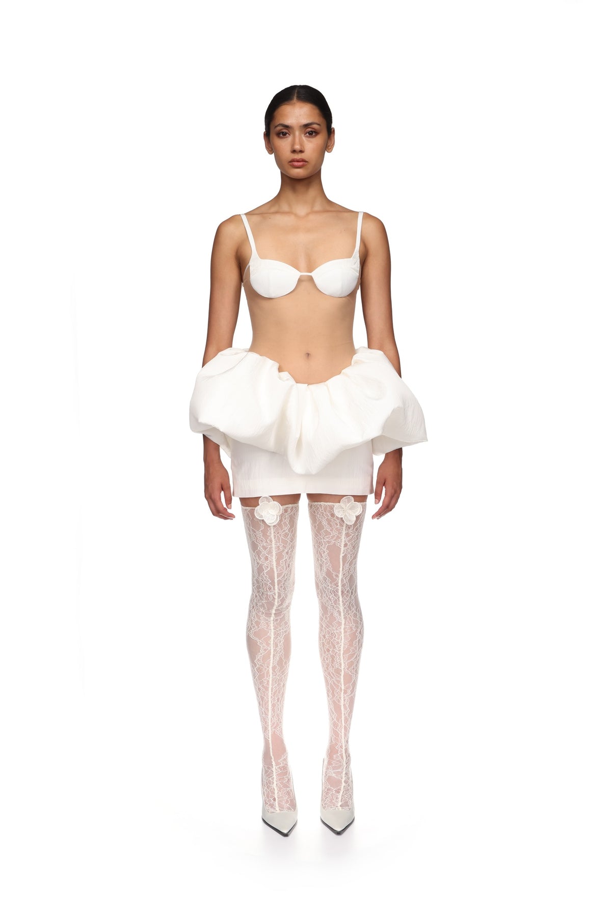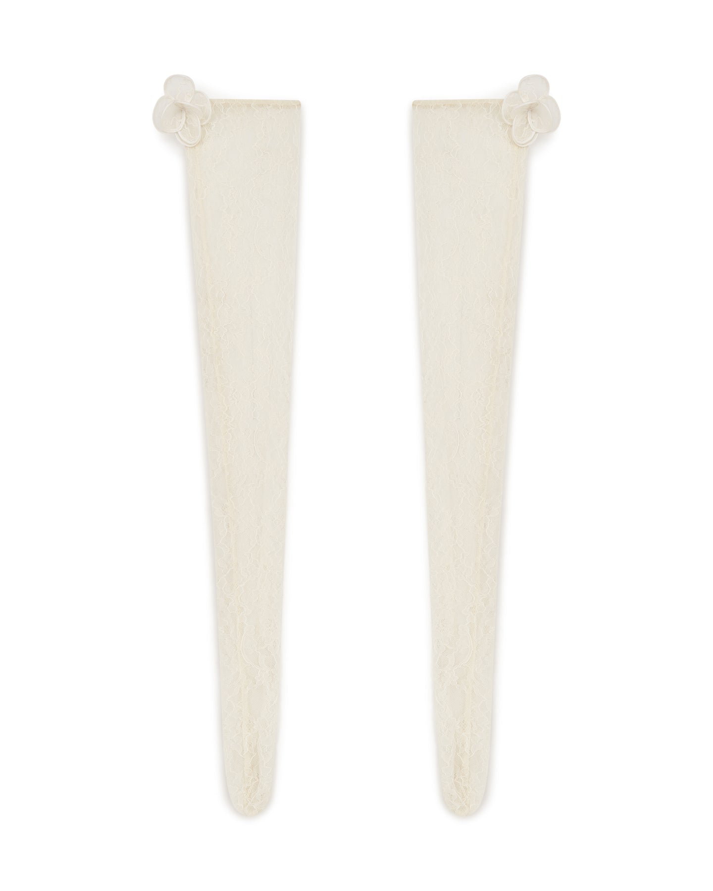 Made in the UK with white lace, these thigh-high stockings feature 3D lace flowers embroidered at the thighs.