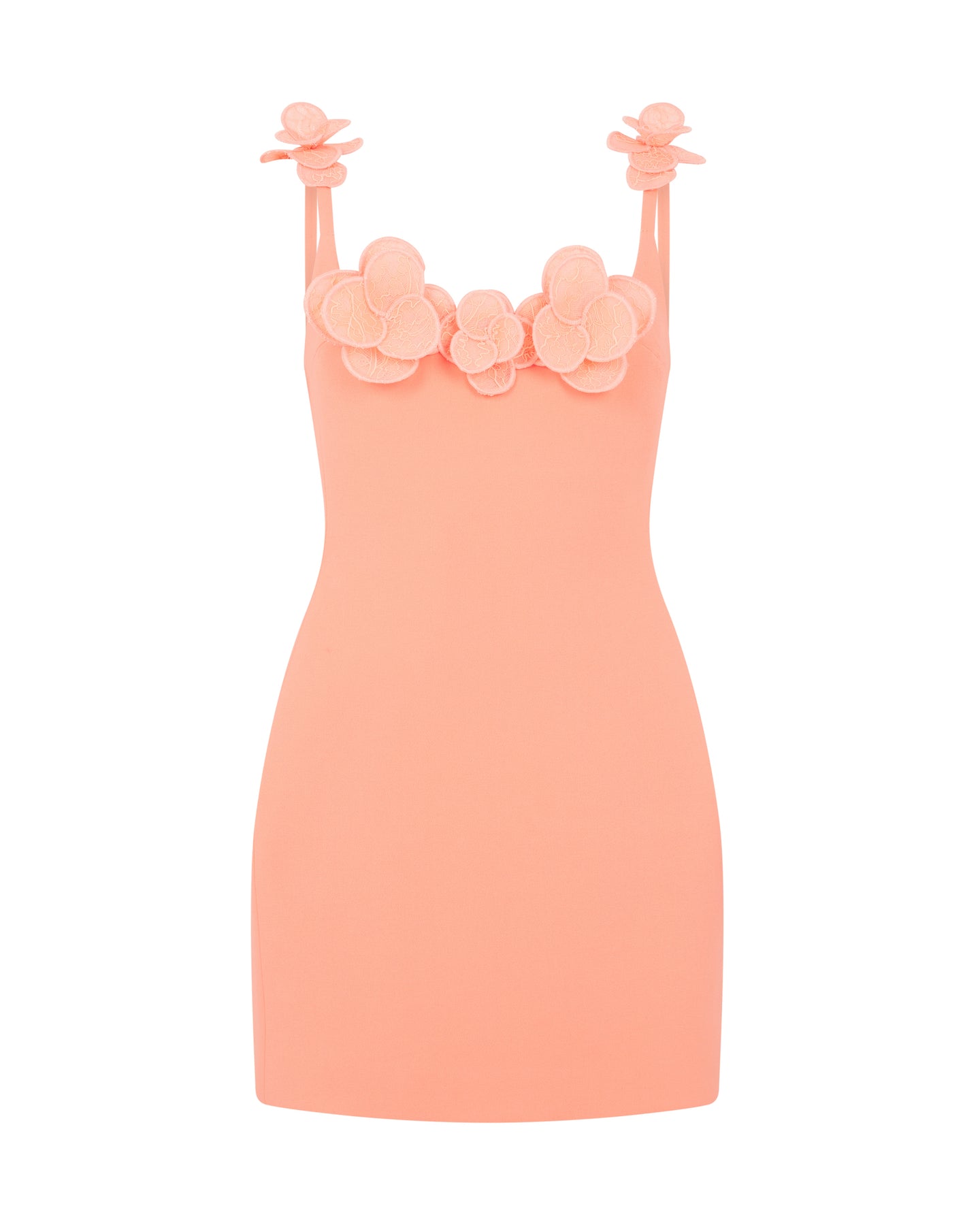 Made in the UK with stretch cady, this peach mini dress has delicate 3D lace flowers embroidered on the straps and over the bust. This dress fastens with a hidden zip closure at the back.