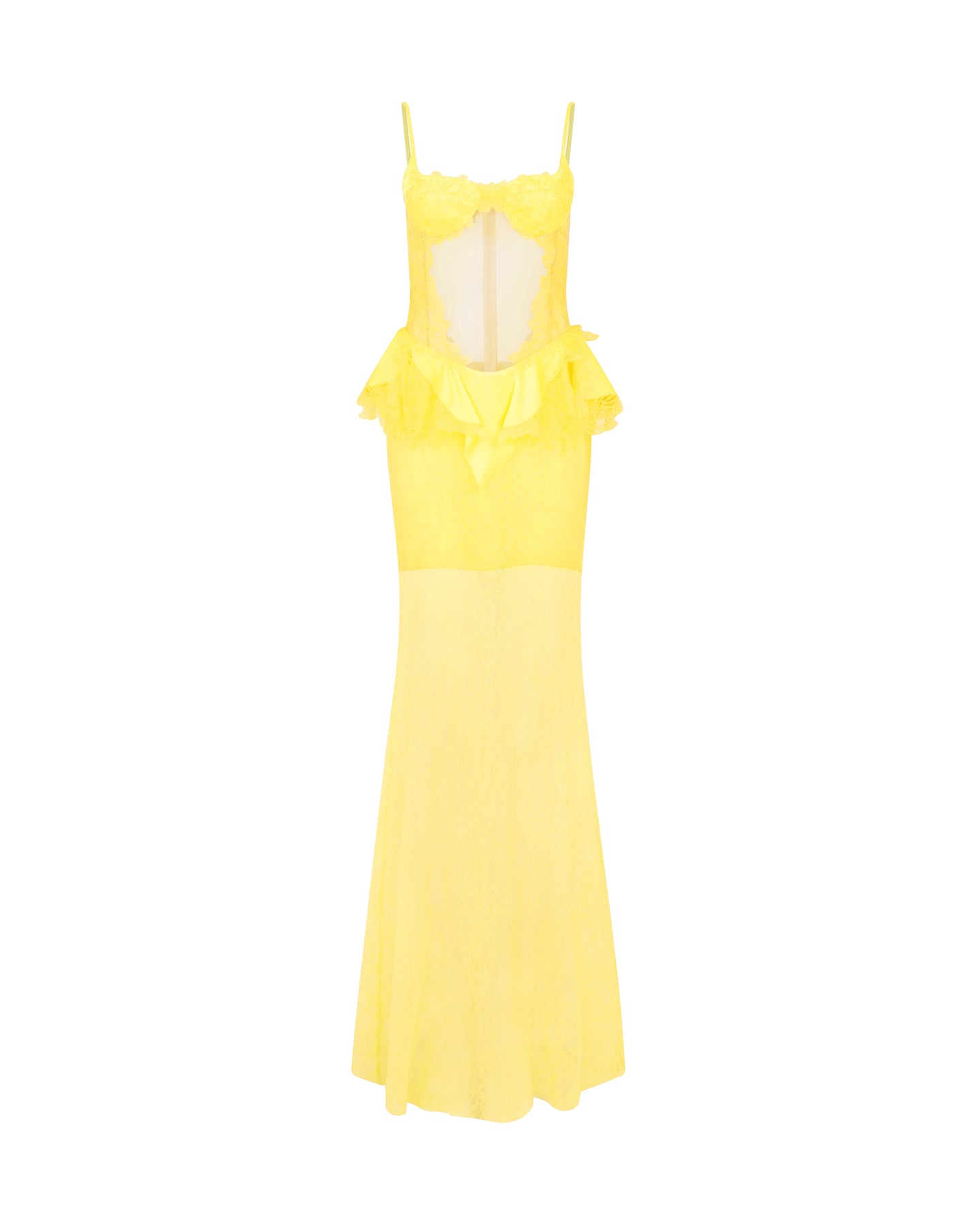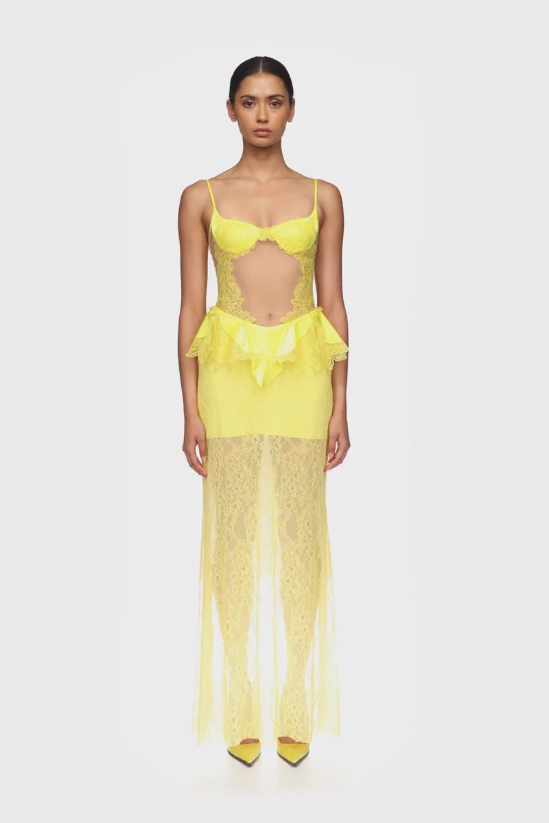 Made in the UK with buttercup yellow satin and lace, this gown has delicate straps, a bra detail with a tulle and lace insert. The long lace skirt features a lace peplum ruffle. This gown fastens with a zip closure at the back.