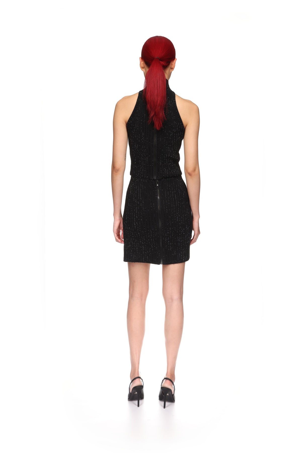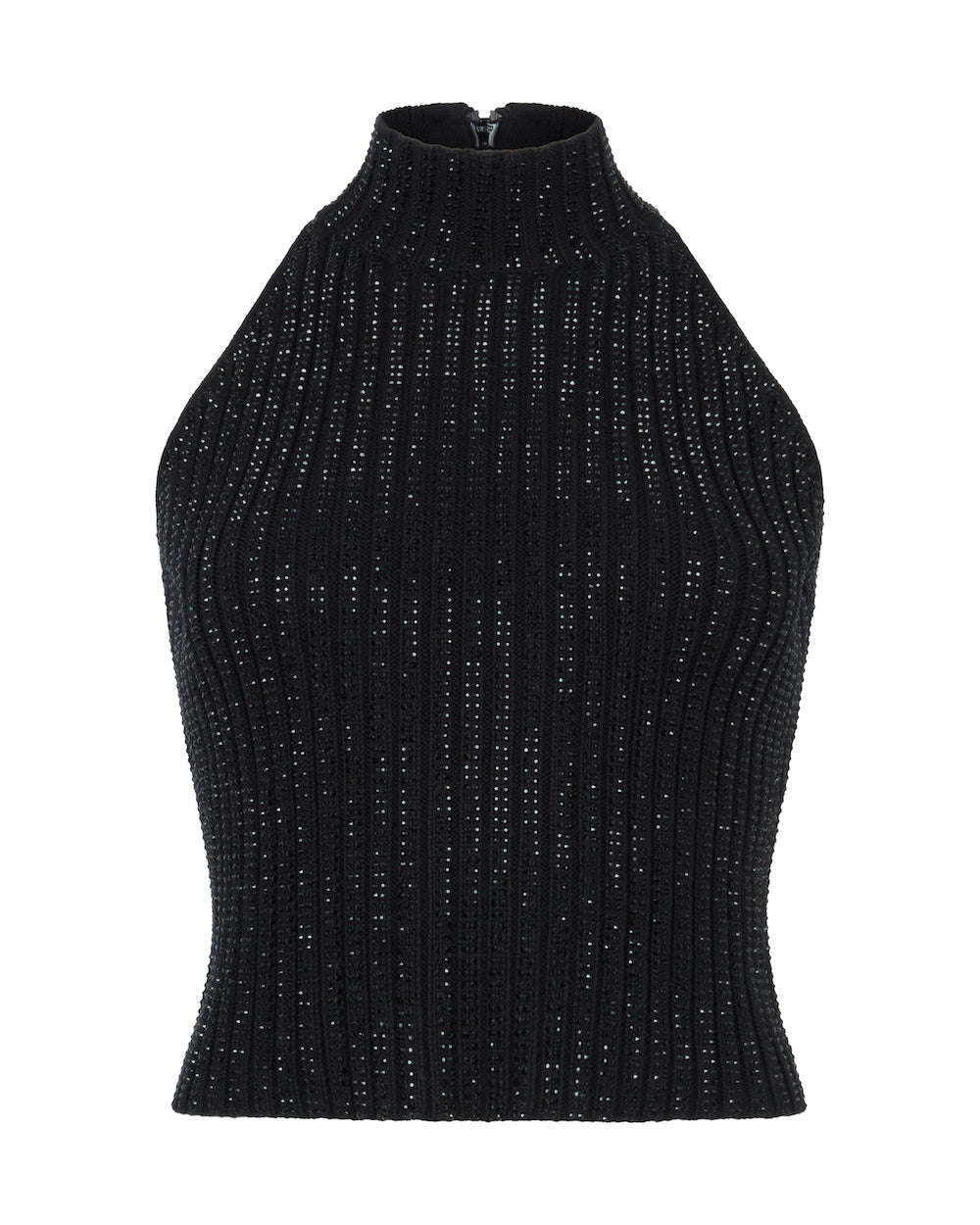 This black loose-fitted knitted top has a turtleneck and sleevless shoulders. It is embroidered all over with tiny silver rhinestones.