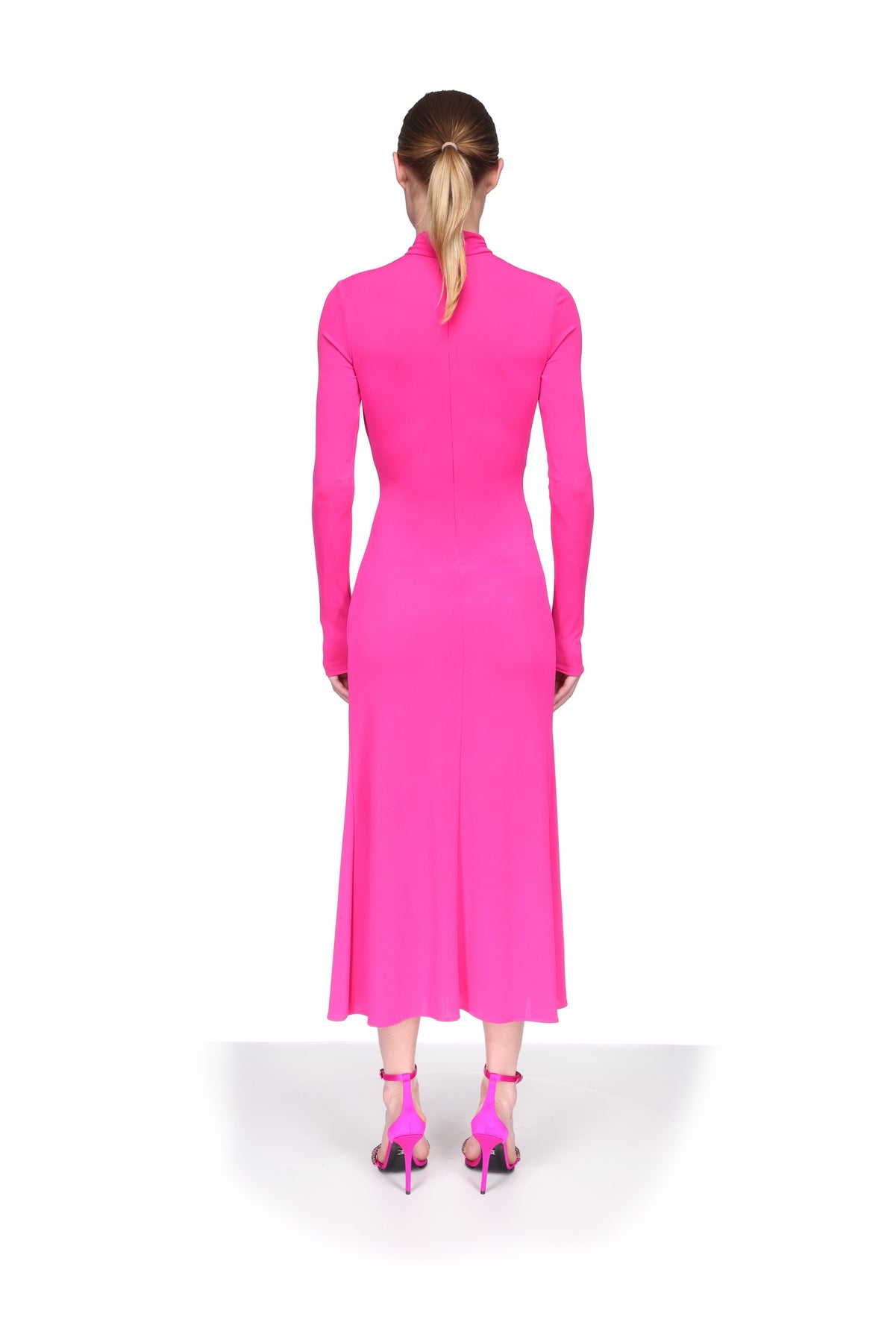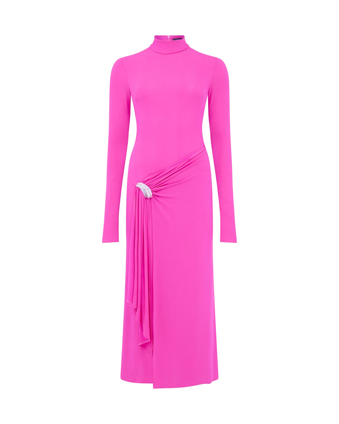 Made in the UK with a fuchsia crepe jersey, this figure-hugging midi dress has a high neck, long sleeves, and drape detail at the hip with a silver crystal arch brooch. This dress fastens with a hidden zip closure at the back.