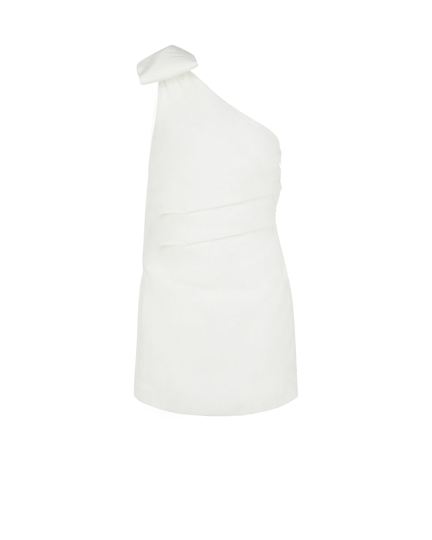 Made in the UK with white taffeta, this one-shoulder mini dress features a taffeta bow on the shoulder. This dress fastens with a hidden zip closure at the back.